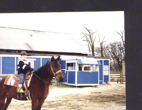 the barn: I currently keep my horses at a private farm about half and hours drive away from my house. It's a cute, efficient little place, with about 50+ acres. My horses stay in a back field, with the LeVines' horses. They have a large lean-to, and about 10 acres of grass to run aroung in. As I've mentioned, there is a family that keeps their horses with mine. The LeVines have three horses... Chicane is their Quarter Horse mare. She's about 5 years old, and 15.1 hands tall. She's sorrel, with tall socks on her hindlegs, short socks on her forelegs, and a star on her forehead. She's a very athletic horse, but sometimes has an attitude problem. :) Master's Tuffy (Diatta) is their 17 year old Quarter Horse gelding. He's about 15.1 hands tall, chestnut, with stockings on his hindlegs, as well as his right foreleg. He also has a neat symmetrical stripe. He's a great guy to use for any type of riding, but the daughter (Lindsey) uses him mostly for English riding, and I show with her during the summer. Donna Mae is their third horse. She's about 17 years old, a part Morgan mare. She isn't riden much, but when she is, you can do a lot with her. At only 13.2 hands tall, she is a 'big' little horse! | ||||||||||||||||